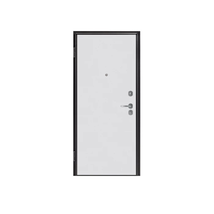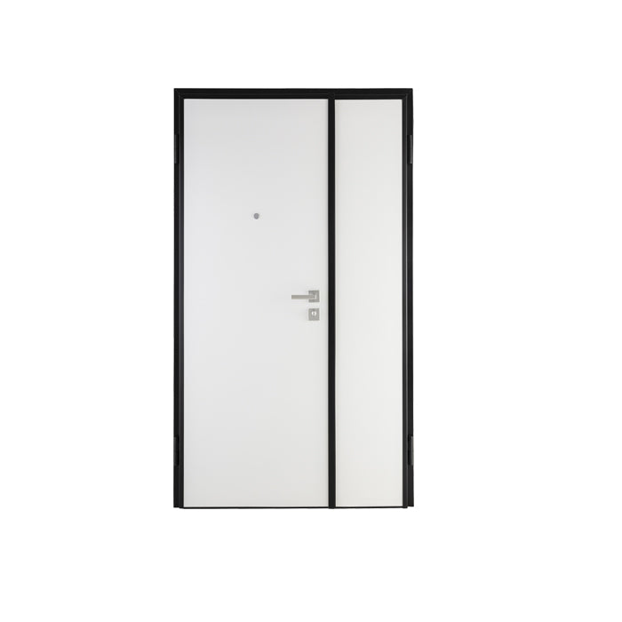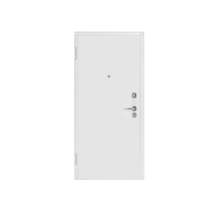 Porta blindata dotata di 7 punti di chiusura, con rinforzi verticali e due lamiere. Serratura a doppia mappa e dotata di 5 chiavi. Telaio e falso telaio inclusi.