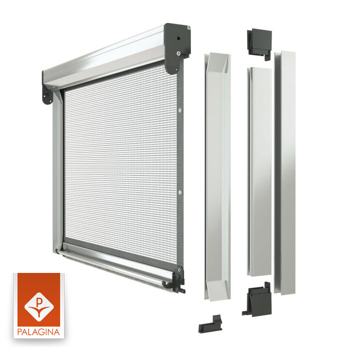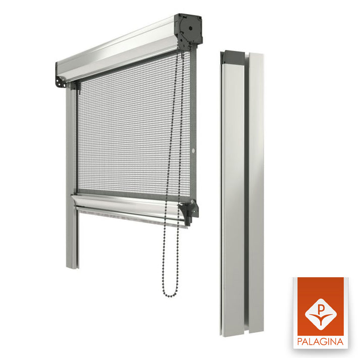 Zanzariera ad avvolgimento verticale con bottoncini antivento laterali. Di serie possiede freno incorporato e guide laterali regolabili.