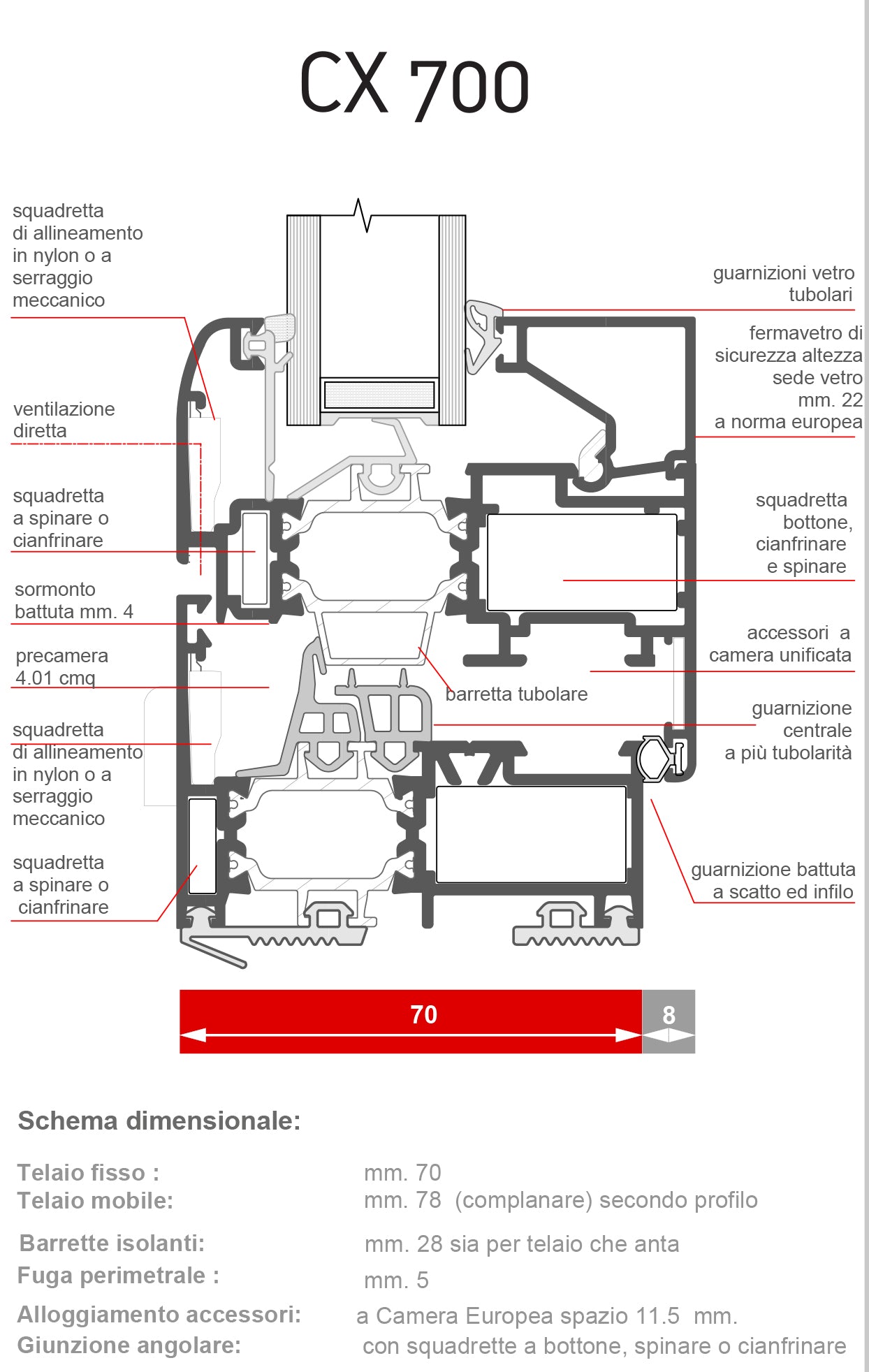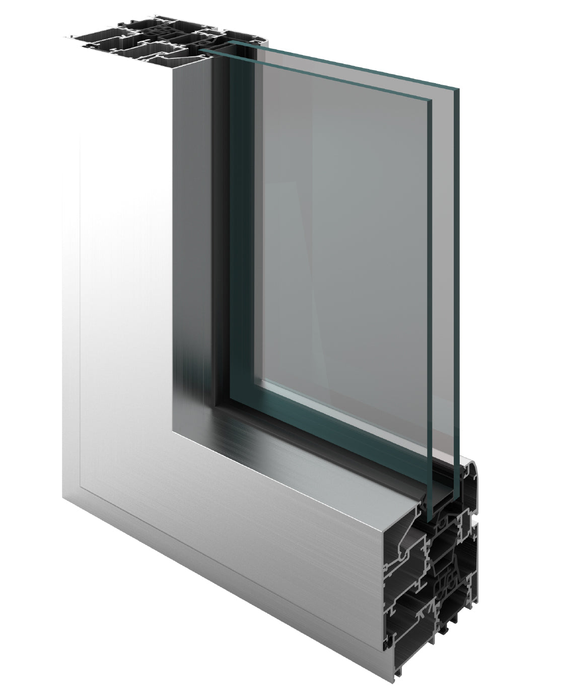 - Profilo in alluminio a taglio termico : 70 mm su 3/4 lati del telaio, 75 mm sull'anta