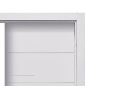 Porta scorrevole interno muro CROSS BIANCO LACCATO, dotata di controtelaio incassato all’interno della parete (in muratura o in cartongesso) non occupa spazio all’interno della stanza, poiché l’anta trasla e scompare all’interno dal muro.