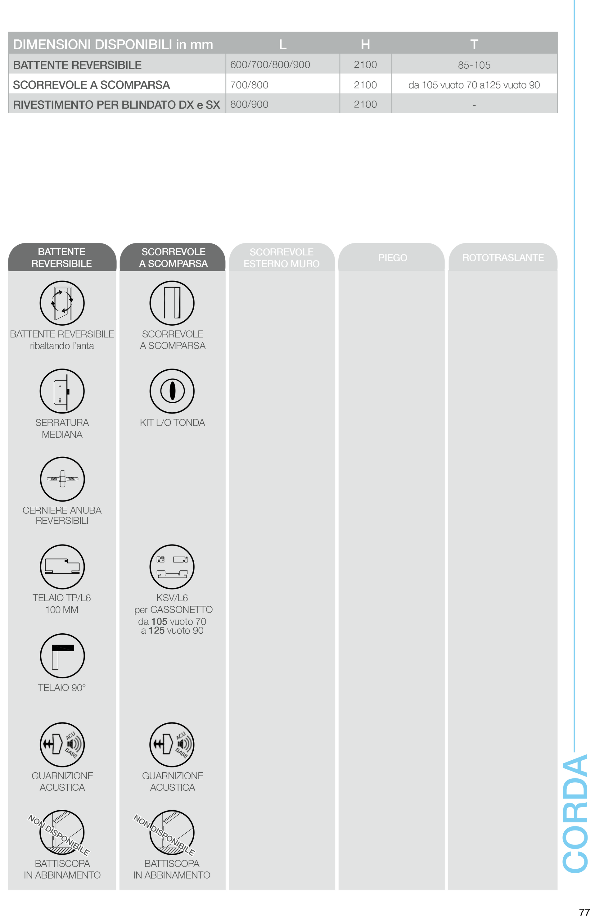 Le collezioni Dynamic, Classic, Style, Trendy e altre includono superfici laccate, effetto legno e tinte neutre (bianco latte, corda, grafite, ecc.).
